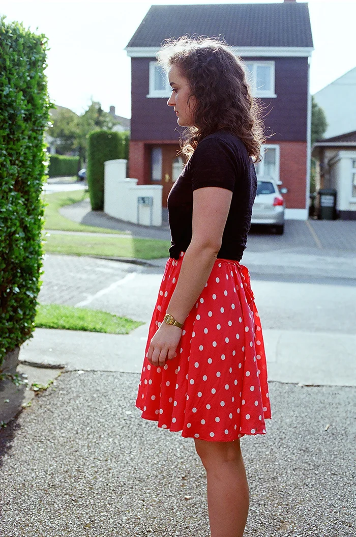 This dress is decidedly not vintage. Well maybe it is, but I couldn’t tell you what era, or what style or who wore it when. I bought it for five euro at a ‘car boot sale’ which was more of a a flea market pretending to be a car boot sale because there was nary a car nor boot in sight. It fit like a glove and even though the hem is a little frayed I stuffed it into my bag and handed over the money as quickly as possible. It’s cute and comfortable and effortless, an outfit-in-one. And five euro for a whole outfit is a steal. It’s super soft and fluid and has a fabulously full skirt that makes twirling with two year olds especially impressive.