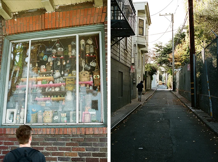 We then wandered around, poked in some thrift stores, looked at some graffiti, passed by this window (below) full of a ridiculously amazing owl collection and found ourselves at Craftsman and Wolves—another well documented and recommended stop—for a late lunch. Next time I would skip the sandwiches and go straight for the pastries. The bread was very crunchy and hard to eat but the nutella croissant squares looked incredible.