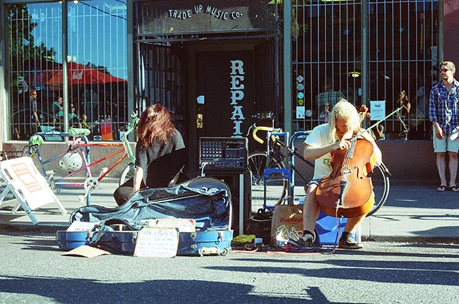 Last Thursday was basically a huge street party and the further down Alberta we walked the crazier things seemed to get. There were every kind of musician, rappers, dancers, brass bands, string quartets, buskers, artists, tshirt sellers, designers, producers, makers and bakers of all kinds and even a couple of cool kids selling delicious lemonade for a 50¢. I bought some beautiful hand made ceramic cups for drinking wine out of and Richard bought a sticker. There wasn’t much we wanted to purchase but the atmosphere and energy was infectious. We stayed out much later than we expected and quickly our crappy day didn’t feel so crappy anymore.